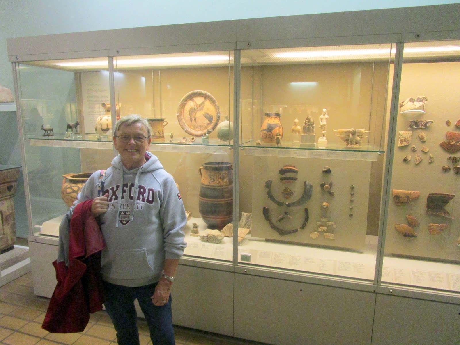 and vases. One of the employees of the museum was passing by and overheard what I said. He stopped to talk to us for several minutes about finding these beautiful antiquities whole and unblemished. Most of the ones that we were looking at were from about 400 BC. He explained that when these items had been found they were buried in shafts going down into the earth. Everything was packed together very carefully. They were not found in archeological "digs" as I had anticipated.